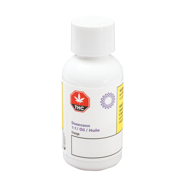 Dosecann Oil in is discreet, convenient, and easy to use. Dosecann 1:1 Oil is made from a potent THC/CBD extract blend and non-genetically modified MCT oil with natural orange flavouring. This bottle has a built-in dropper that delivers 1mg of THC and CBD every 4 drops. This oil product is for oral use only. DO NOT smoke or vape this oil. ***Syringe not included***