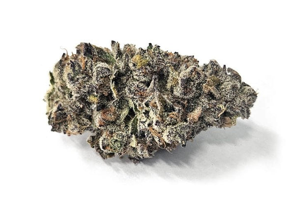 Jet Fuel Pie is a tightly-packed indica-leaning hybrid that’s heavy with trichomes. Its flowers have primarily eggplant-coloured exteriors, giving way to lime-green on the inside with long strands of bright orange coming through all over. Its scent profile and flavours are both creamy and fruity, and contrary to the name, its diesel fuel notes are hiding under the surface.