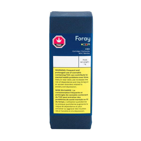 Foray’s 1g Mint CBD cart is made with premium CBD distillate and contains only two ingredients: cannabis distillate and botanical terpenes. Menthol is the dominant terpene for this fresh-tasting cart and contains a sweet, earthy, minty undertone. Designed for the curious, Foray looks to both celebrate and simplify one’s foray into cannabis.